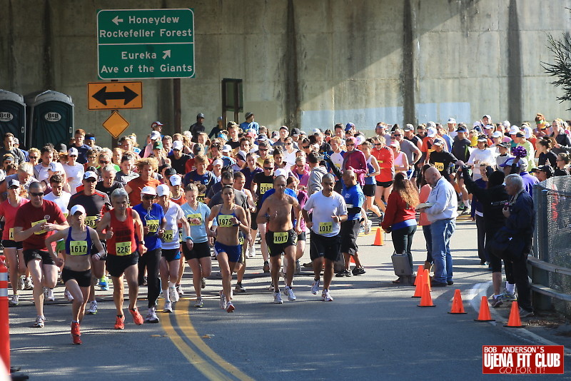 This year was the 41st annual Ave of the Giants Marathon. In later years they added the Half Marathon and then the 10k. Marathoners wore white numbers, half marathoners yellow numbers and 10k runners wore blue. It was a perfect day to race through the Redwoods. This was Bob Anderson's (2267) 20th race of the year. He was first 60 plus and 22nd overall. He ran 1:32:47. Photos by Catherine Cross Ujena Fit Club